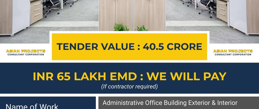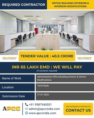 This project involves the comprehensive overhaul of an Administrative Office Building in Tamil Nadu, encompassing both sophisticated exterior facelifts and modern interior modifications. With a tender value of 40.5 Crore, the scope includes civil works, interior design, and MEP updates to transform the workspace into a contemporary corporate environment. APCC is committed to partnering with a contractor who brings innovation and precision to the table. To facilitate participation, we have made the unique provision to pay the INR 65 Lakh EMD if the contractor requires it. Please submit your expression of interest by 27-01-2026 to be considered for this landmark renovation.