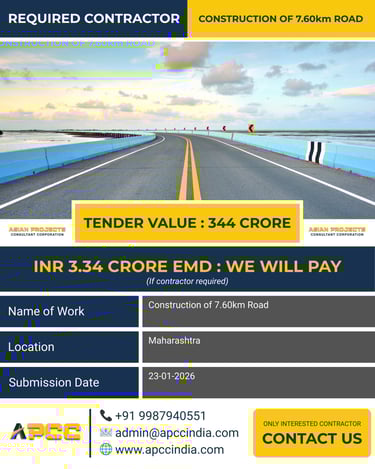 A major infrastructure opportunity is available in Maharashtra for the construction of a 7.60km road section. With a massive tender value of 344 Crore, this project is a critical component of the state’s transport expansion and requires a contractor with a proven track record in heavy civil engineering and asphalt works. APCC is dedicated to ensuring a smooth procurement process, which is why we are offering to pay the INR 3.34 Crore EMD for the contractor. This financial support allows you to focus your resources on mobilization and excellence in execution. Don’t miss this chance to contribute to Maharashtra's growth. Submission deadline: 23-01-2026.