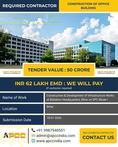 A critical development project at the Battalion Headquarters in Bihar is now open for bidding under EPC Mode-I. This project, valued at 50 Crore, involves the construction and development of essential infrastructure, requiring a contractor capable of managing "Design-Build" responsibilities effectively. APCC is looking for a dedicated partner to deliver this project to the highest standards. To assist with the financial requirements of the tender, APCC will pay the INR 62 Lakh EMD for the contractor. This allows you to focus on the technical proposal and project delivery. Ensure your submission is completed by the early deadline of 18-01-2026.