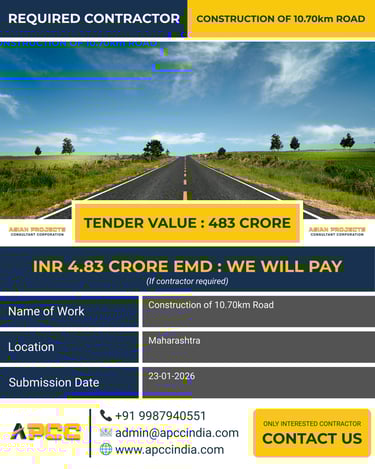 This significant infrastructure project involves the development of a 10.70km road stretch in Maharashtra, with a tender value of 483 Crore. The scope covers earthworks, paving, and drainage systems essential for long-term durability. APCC understands the challenges of managing large-scale tenders, which is why we are offering a unique financial partnership: we will pay the INR 4.83 Crore EMD if required by the contractor. This proactive approach ensures that top-tier contractors can compete based on their engineering merit rather than financial constraints. Ensure your application is submitted by 23-01-2026 to take part in this transformative Maharashtra project.